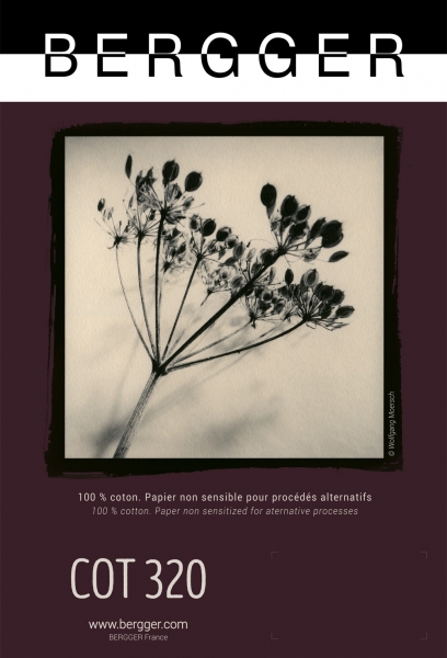 Bergger Cot 320 is an art paper, made in France, designed for alternative printing techniques.This uncoated paper is made of 100% cotton. Originally designed as the fiber base for Bergger's highly acclaimed “Silver Supreme” paper, this uncoated version is extremely high-quality. It has a base weight of 320 gsm and is especially suitable for darkroom processes. The excellent sizing of the paper makes hand coating easy and consistent. This paper is characterized by the different surface structures on the front and back. Both sides are excellent for coating. Bergger Cot 320 has a bright white surface with just a touch of warmth. In addition to platinum and palladium printing, this paper is also perfect for cyanotype, Ziatype, Van Dyke, Kallitype and flexographic printing.